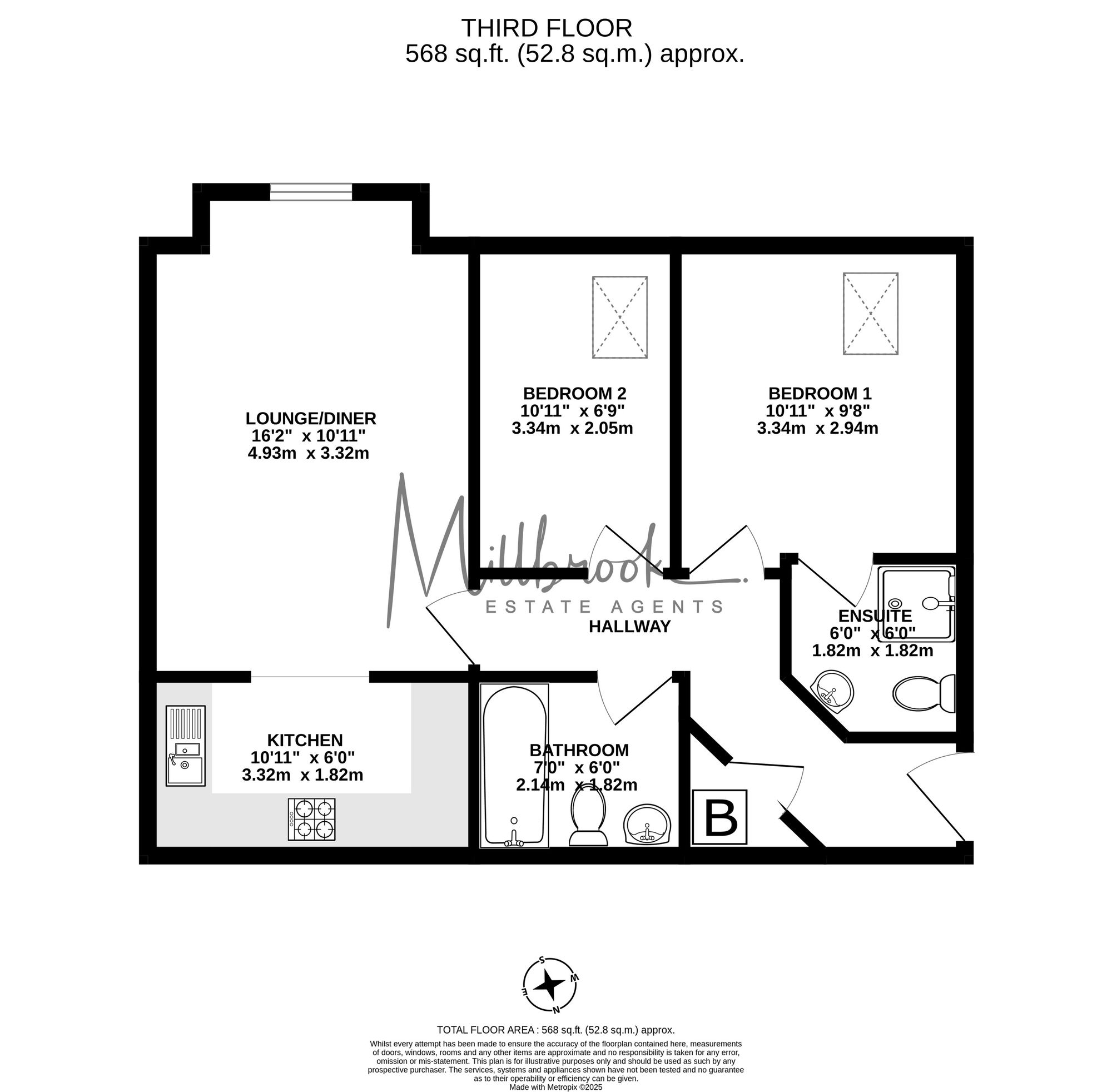 From a lift offering access to all floors, step inside to a welcoming entrance hallway with built-in storage cupboard and intercom access. The bright lounge with feature window leads through an open archway to a stylish kitchen, fitted with contemporary units, integrated oven, grill, gas hob, cooker hood, fridge freezer, and washing machine. There are two generously sized double bedrooms, including a master with en suite shower room, along with a separate modern bathroom.