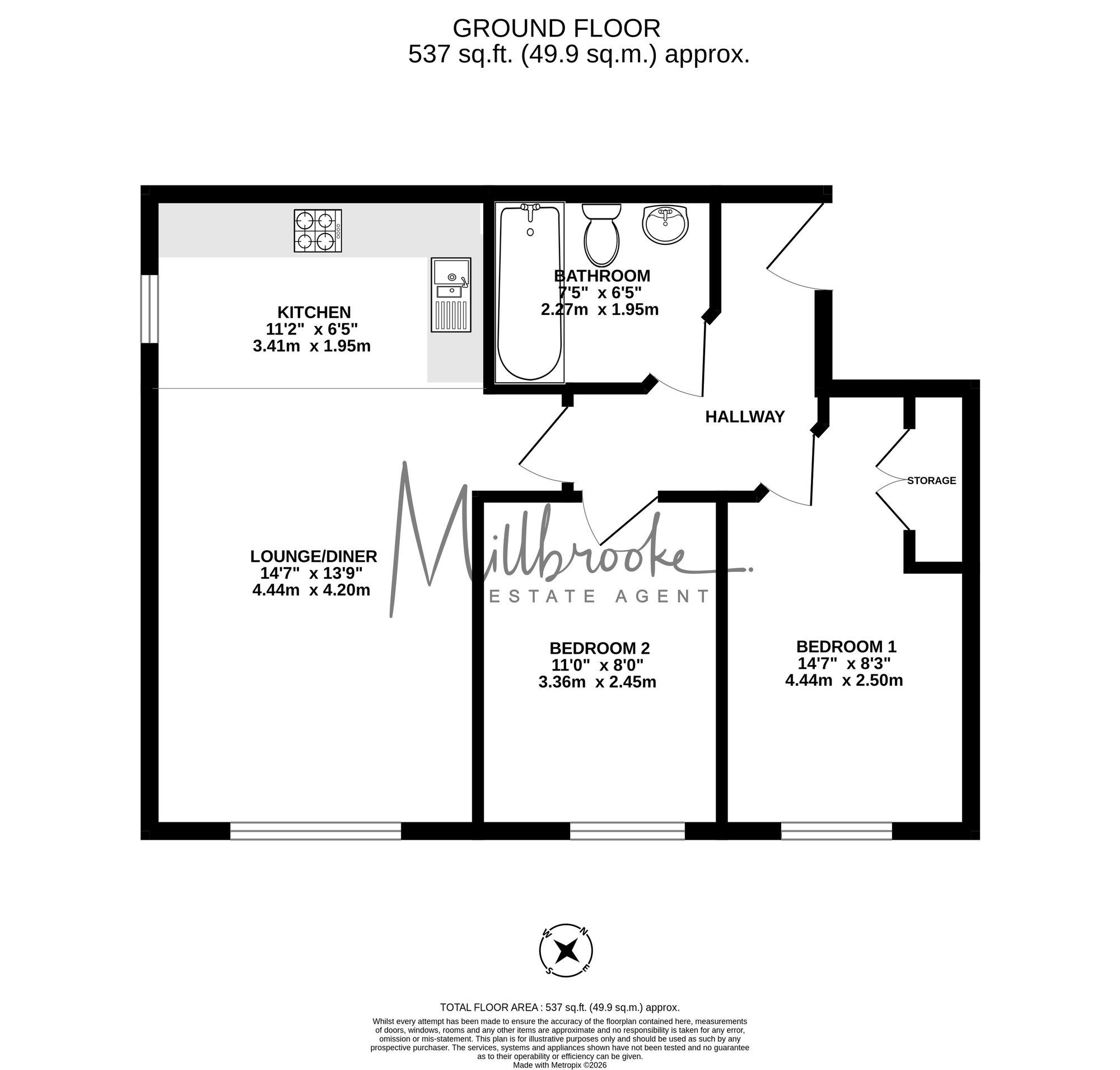 The kitchen is fitted with wall and base units, complemented by sleek countertops and a brushed metal backsplash behind the hobs. It features a fitted integrated electric oven, grill, a gas four-ring hob, a stainless steel chimney extractor, and space for a washer/dryer and a separate under-counter integrated fridge and freezer. There are two well-proportioned double bedrooms with ample room for freestanding furniture. A contemporary bathroom completes the accommodation.
