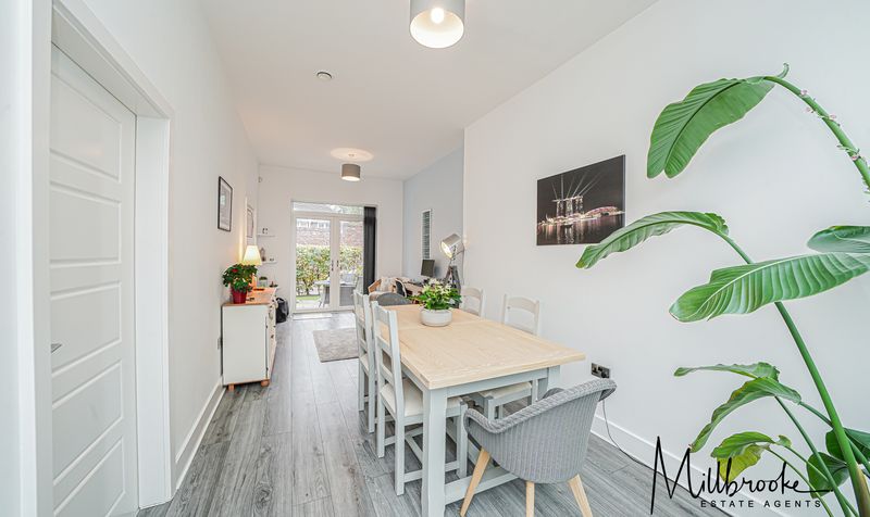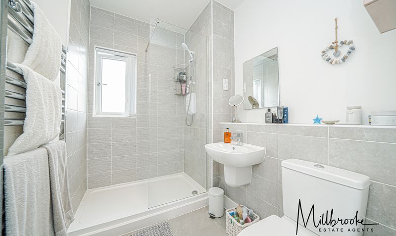 To the first-floor front elevation there are three bright and spacious double bedrooms, the master bedroom with en-suite shower room and a walk-in wardrobe. A contemporary three-piece family bathroom with shower over the bath completes the internal accommodation. Externally, the property has driveway parking for two cars to the front elevation, and a private south-facing garden with patio area and lawn.