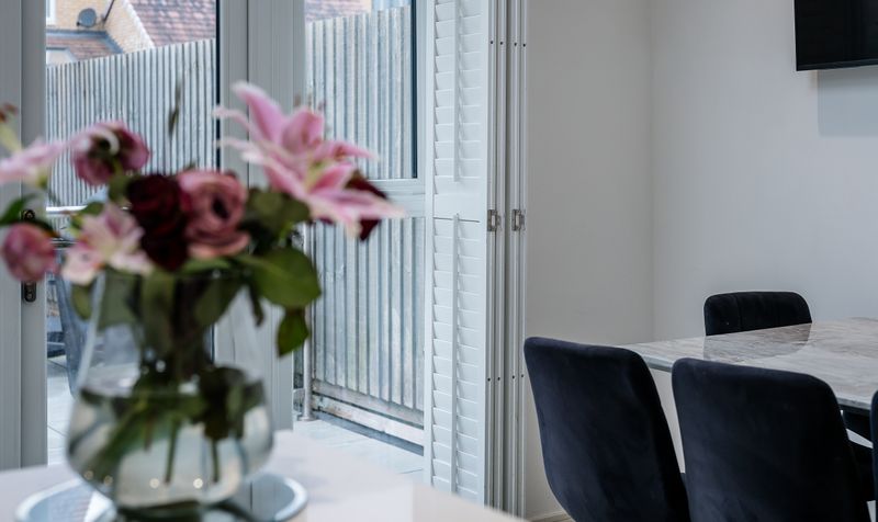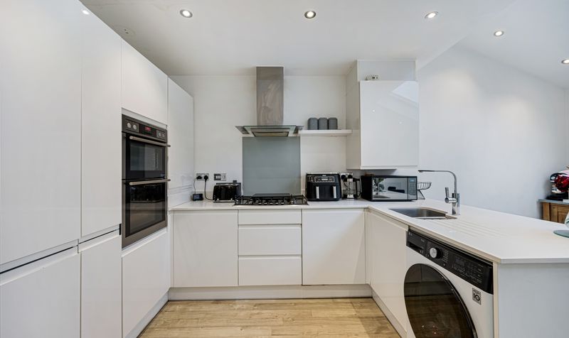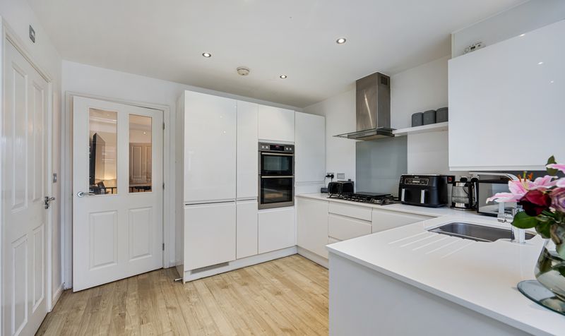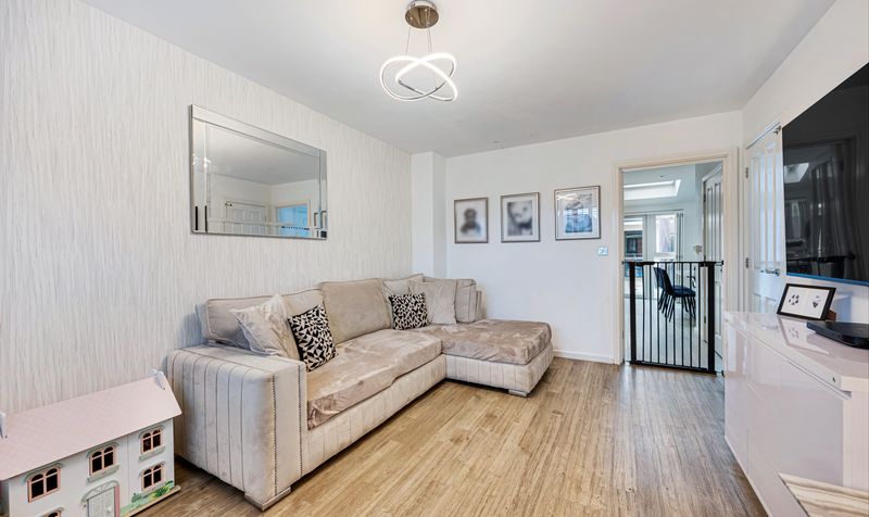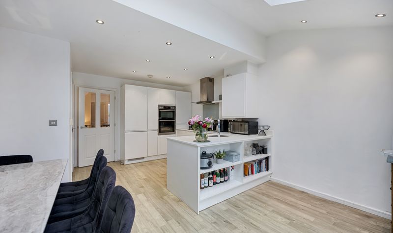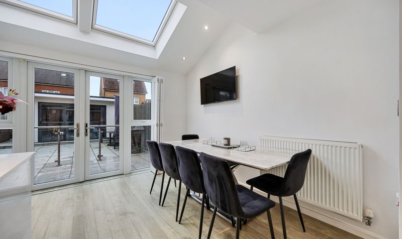 Upon entering the property you will discover a welcoming entrance hallway, leading through to a contemporary lounge, complete with useful storage cupboard, positioned to the front elevation. To the rear of the property sits the true heart of the home – an impressive open-plan kitchen and dining space, flooded with natural light from roof windows and full-height French doors that open directly onto the rear garden. The kitchen is sleek and contemporary, fitted with modern cabinetry, integrated appliances and generous worktop space, creating a sociable and practical environment for both everyday living and entertaining. A convenient ground floor WC completes the ground floor.