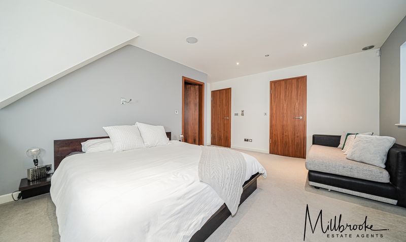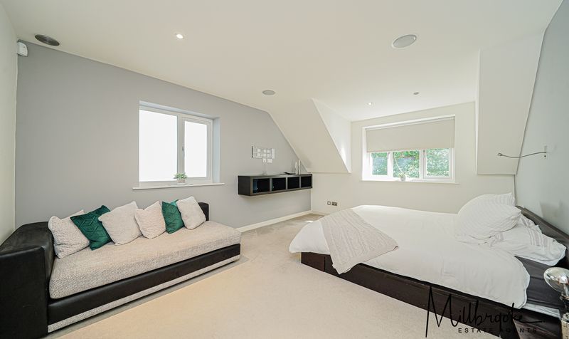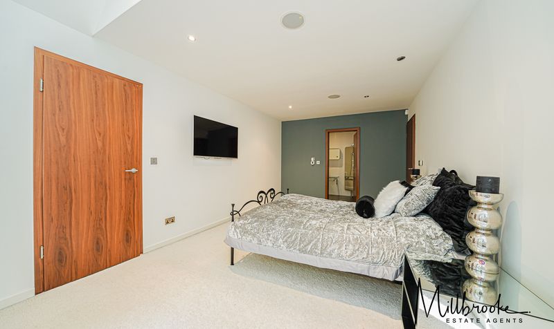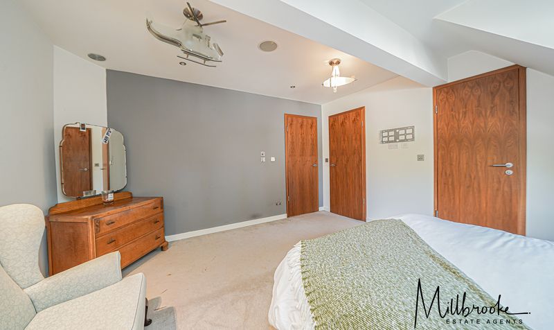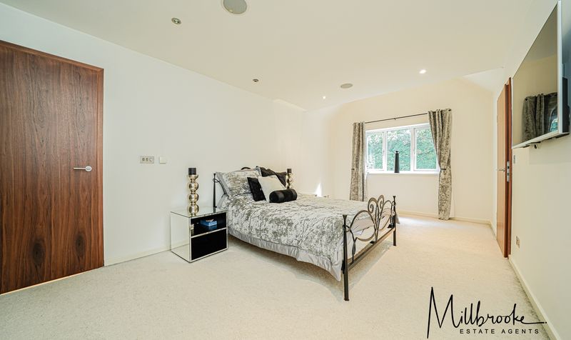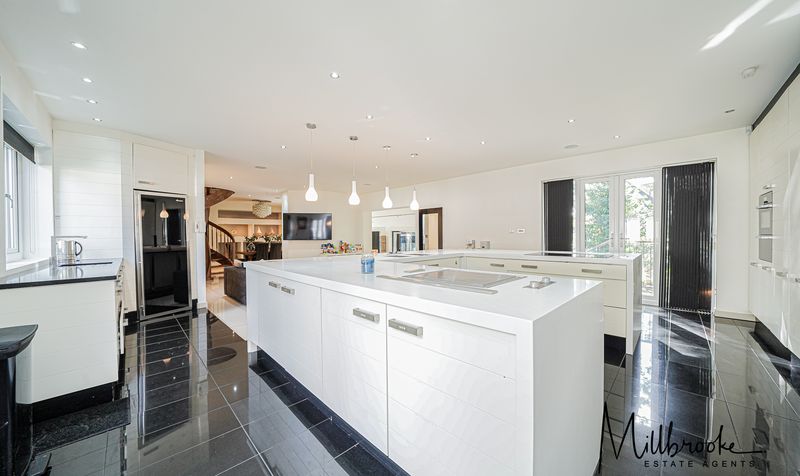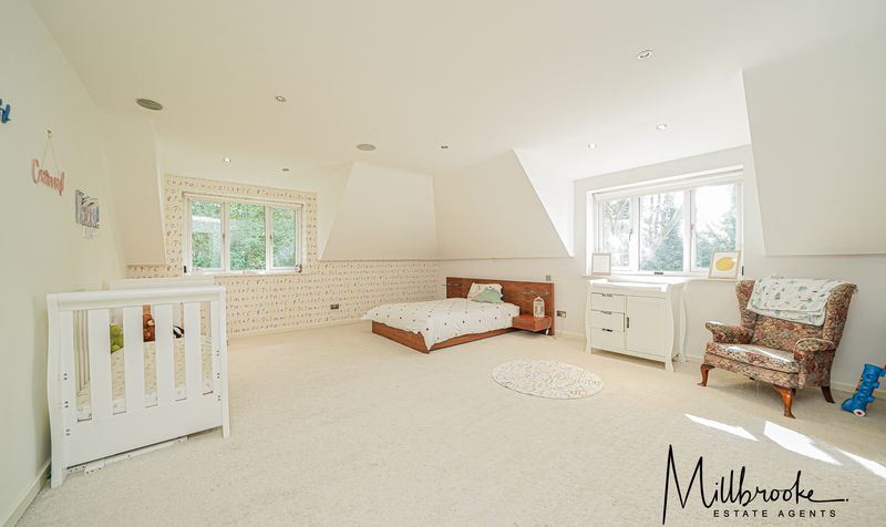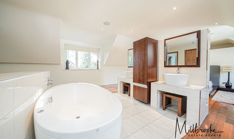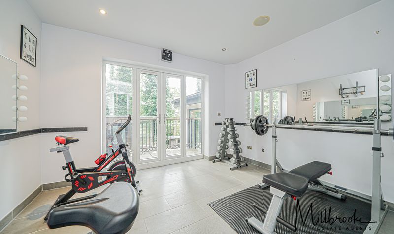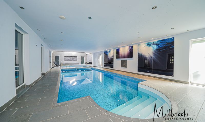 Through the French doors from the lounge, you will find a state-of-the-art leisure and spa facility complete with a private gym, showers and changing, a substantial swimming pool, jacuzzi, spa room, and steam room. To the first floor, you will find a vast hallway with multiple storage cupboards, the master suite complete with its own private shower room, and an open plan bathing area with his and hers wash basins plus a walk-in wardrobe space. A further five large double bedrooms, all completed with en-suite bathrooms.