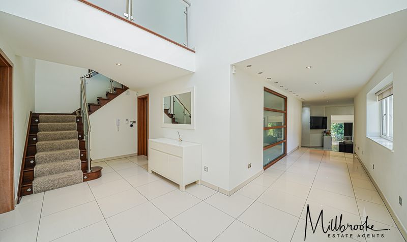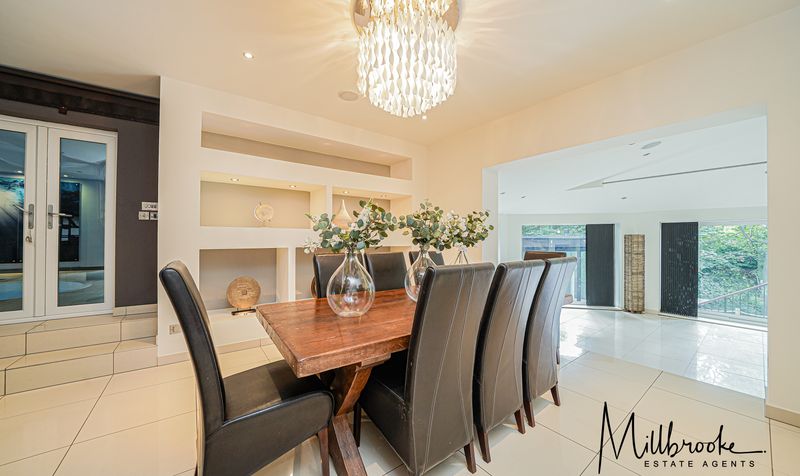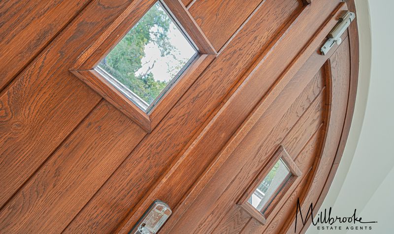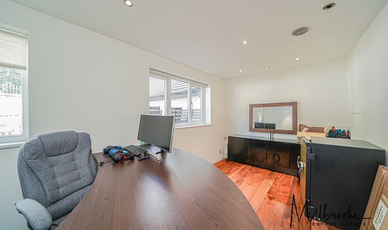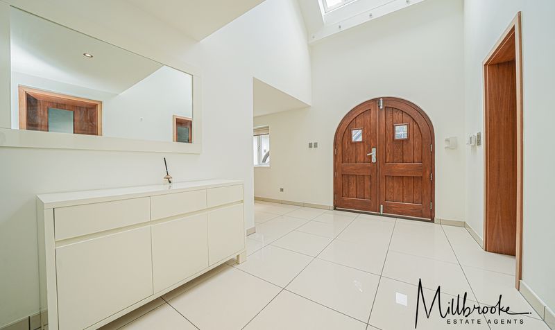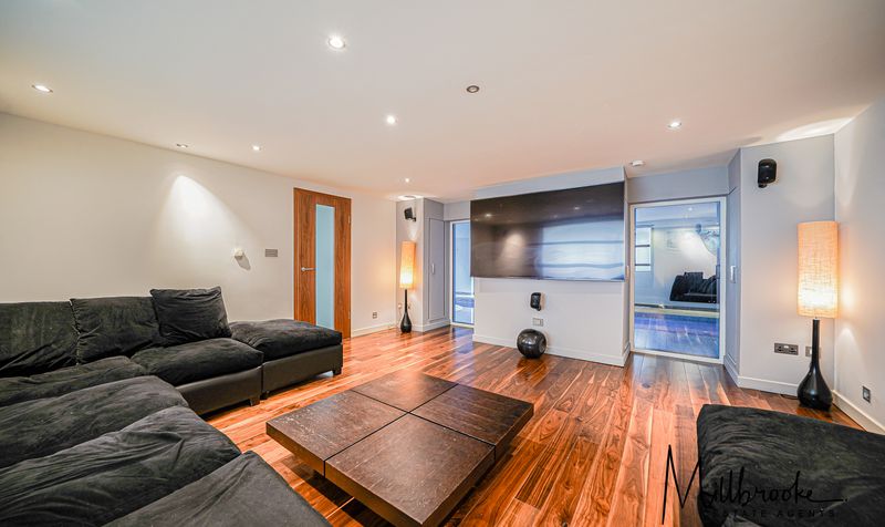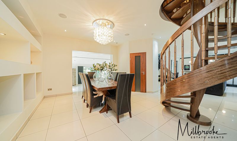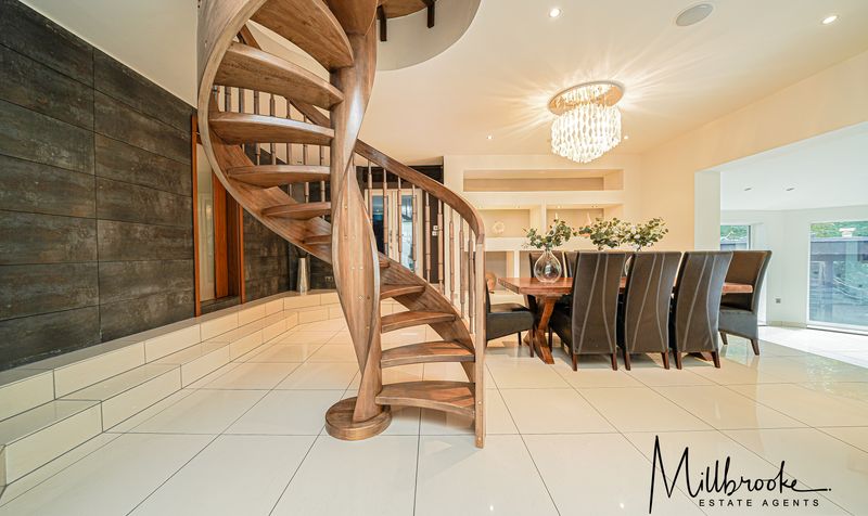 As you enter the property via the large oak doors, you are greeted by a bright and spacious hallway with a store room and study. As you make your way down the hall, you will find a bespoke soundproofed cinema room with a view of the swimming pool. At the end of the hallway is the large open-plan kitchen/family room, complete with a high-end, fully fitted kitchen and Corian surfaces. Hidden away behind the main tower units is access to the utility room and a separate walk-in pantry. For more formal dining, you will have a dedicated dining space beautifully finished with a bespoke alcove unit and a spiral staircase to the first floor. To the rear elevation is a vast south-facing conservatory offering a range of functionality.